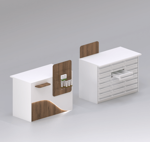 Farmarack Counter merges a durable service surface with concealed drawer storage, ensuring a clean area for efficient prescription preparation and customer interaction.