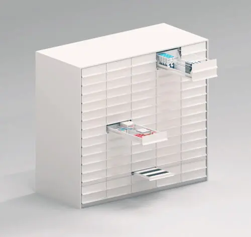 Farmarack is a drawer storage system for medicine and suitable medical supplies in pharmacies and other medical establishments. Farmarack ensures the most efficient space usage by offering a high volume storage with minimal footprint.